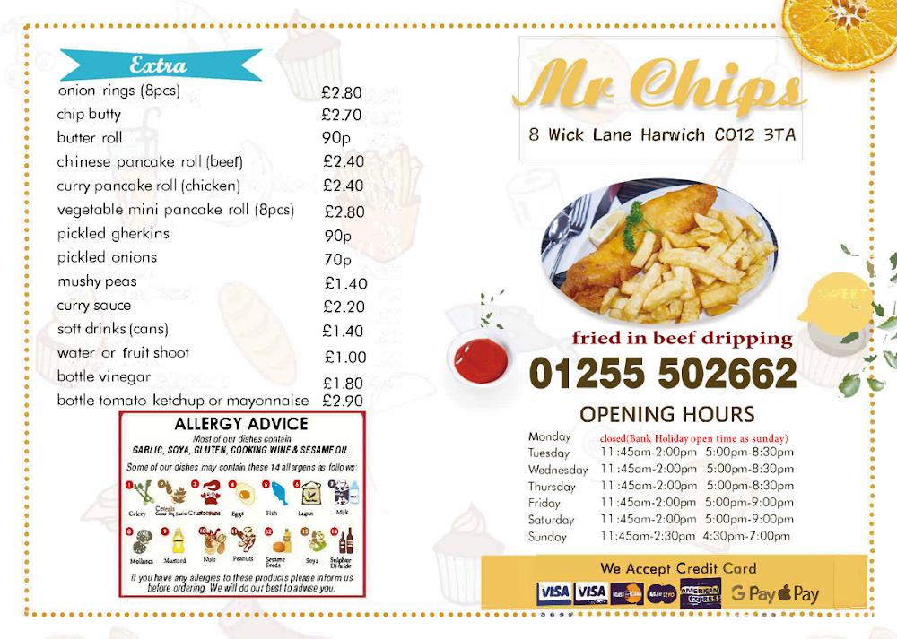 Located at 8 Wick Ln, Harwich CO12 3TA, Mr Chips provides a convenient dining option for both locals and tourists. The area offers free on-street parking, with easy access to a wheelchair-friendly car park. This chip shop is known for its ambiance that welcomes families and diners looking for a laid-back meal experience. Just a few minutes from the promenade, Mr Chips is strategically placed to catch the foot traffic of those enjoying their time by the sea. The takeaway, delivery, and dine-in options cater to all preferences, whether you're in a hurry or want to sit back and enjoy your meal. Visitors can expect a wait during peak hours, but the payoff comes in the form of freshly cooked dishes prepared with care. The friendly staff enhances the community vibe, ensuring a pleasant dining experience for everyone. Regular visitors often share tales of their favorite dishes, making Mr Chips a small hub for food lovers in Harwich.